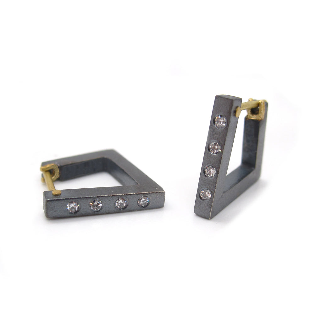 Oxidized silver geometric hoops, with 18k yellow gold wires and white diamonds. Perfect for everyday. These are 1/2" long and wide and the diamonds weigh .11ctw.
